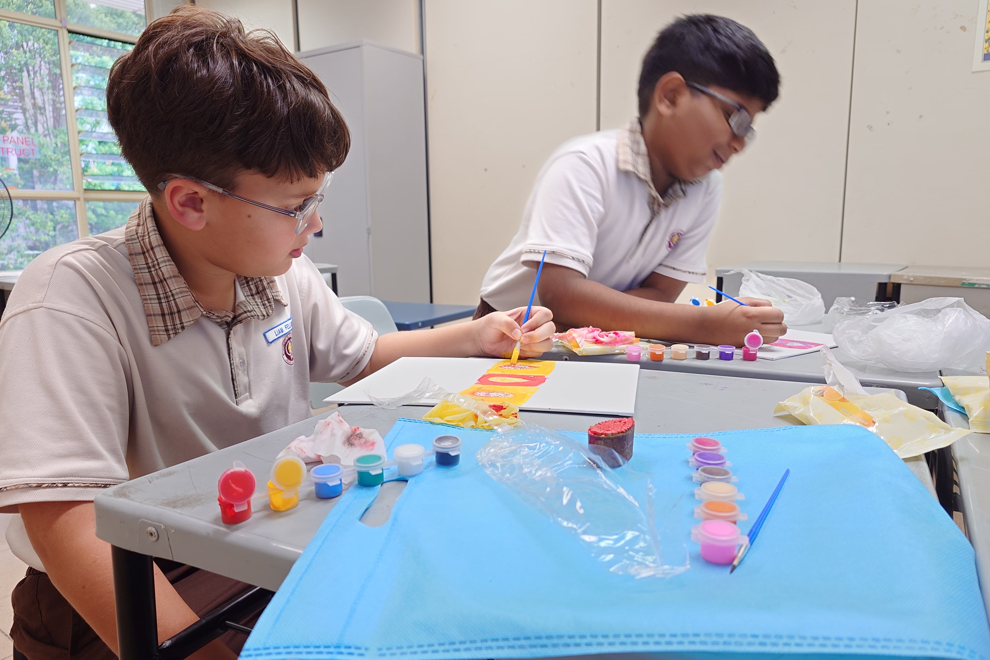 Students were taught about the history of the various traditional fabric patterns and methods in which the traditional fabric was decorated. They were then encouraged to explore and create their own fabric pattern via the “Block printing” method.